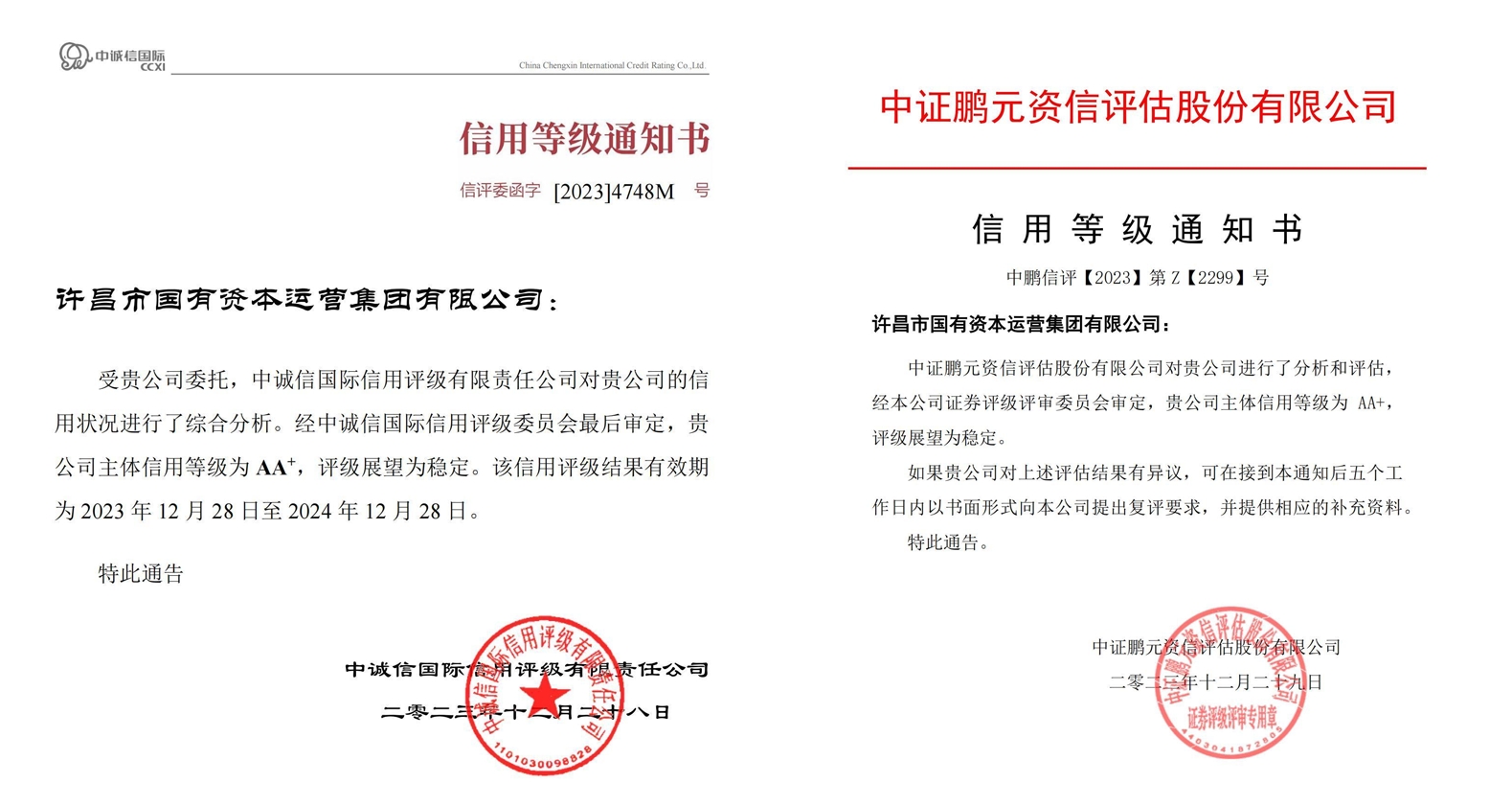 2023年12月28日、12月29日,經(jīng)國內(nèi)權(quán)威評(píng)級(jí)機(jī)構(gòu)中誠信國際信用評(píng)級(jí)有限責(zé)任公司、中證鵬元資信評(píng)估股份有限公司專業(yè)評(píng)定,許昌市國有資本運(yùn)營集團(tuán)有限公司先后獲得AA+主體信用評(píng)級(jí),評(píng)級(jí)展望為穩(wěn)定。