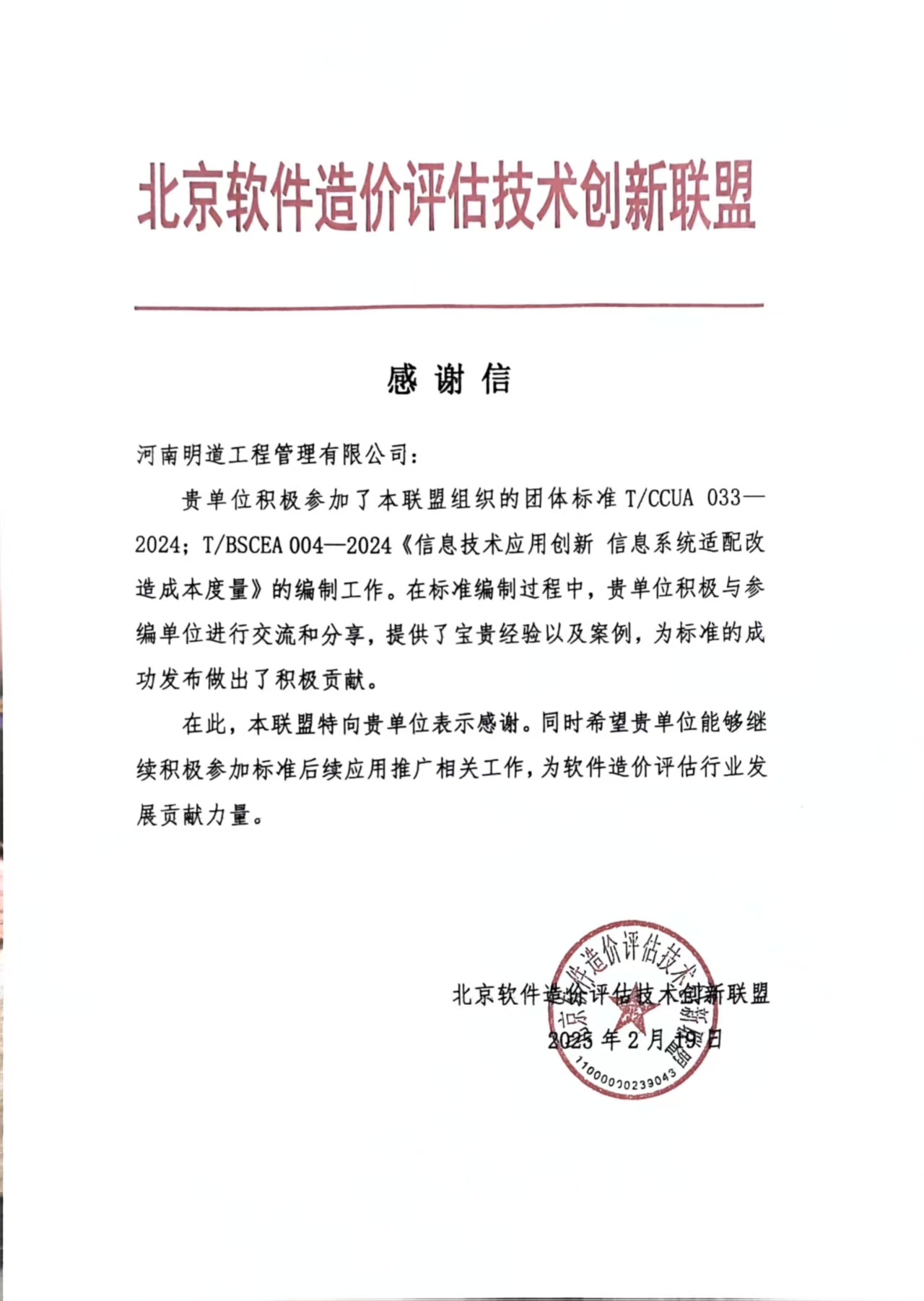 2025年2月19日,河南明道工程管理有限公司收到北京軟件造價評估技術(shù)創(chuàng)新聯(lián)盟發(fā)來的感謝信,聯(lián)盟對于明道在《信息技術(shù)應(yīng)用創(chuàng)新 信息系統(tǒng)適配改造成本度量》(T/CCUA 033-2024)的編制工作中做出的積極貢獻(xiàn)表示了充分的肯定和由衷的感謝。